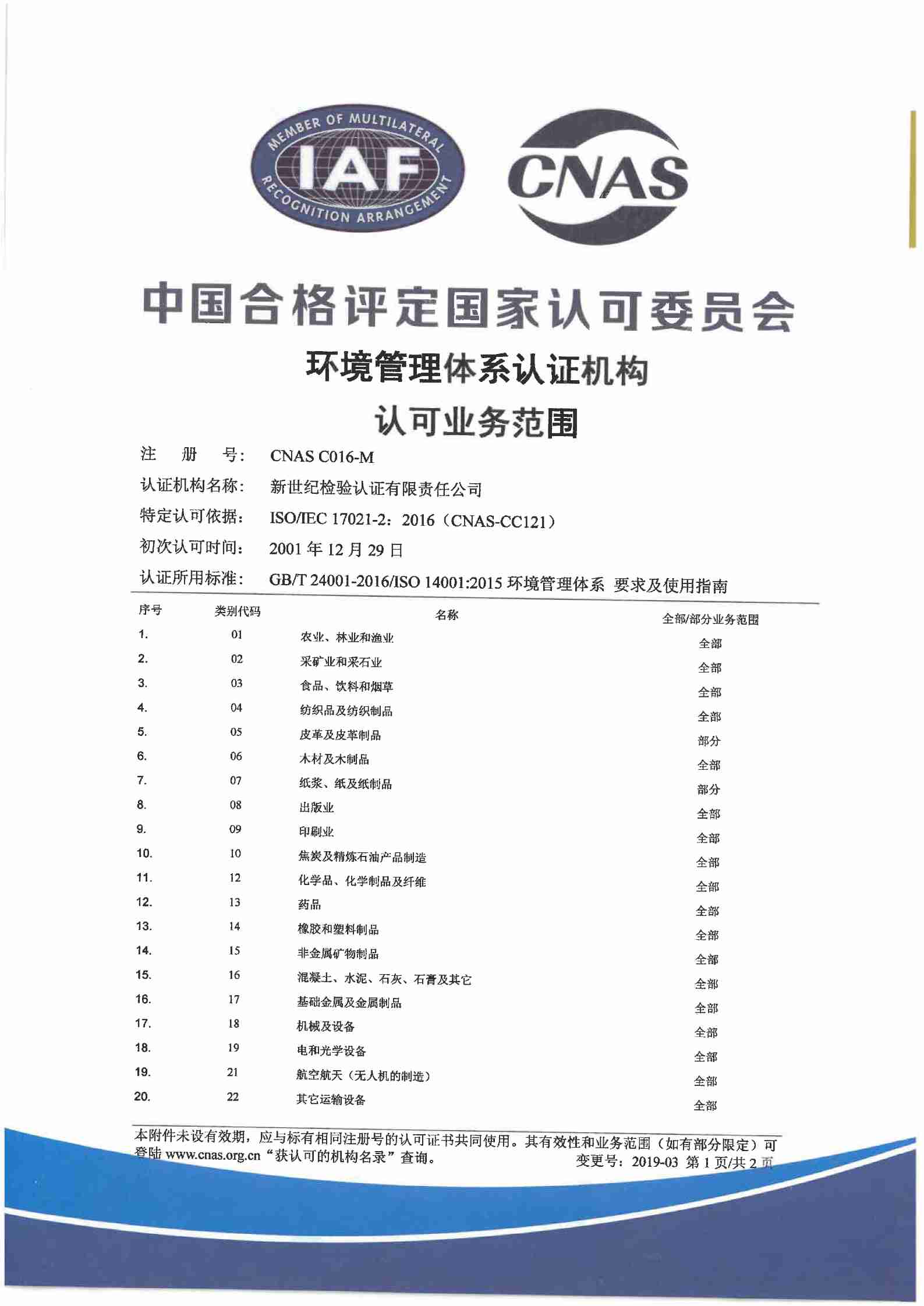 環(huán)境管理體系認證機構認可證書(一)