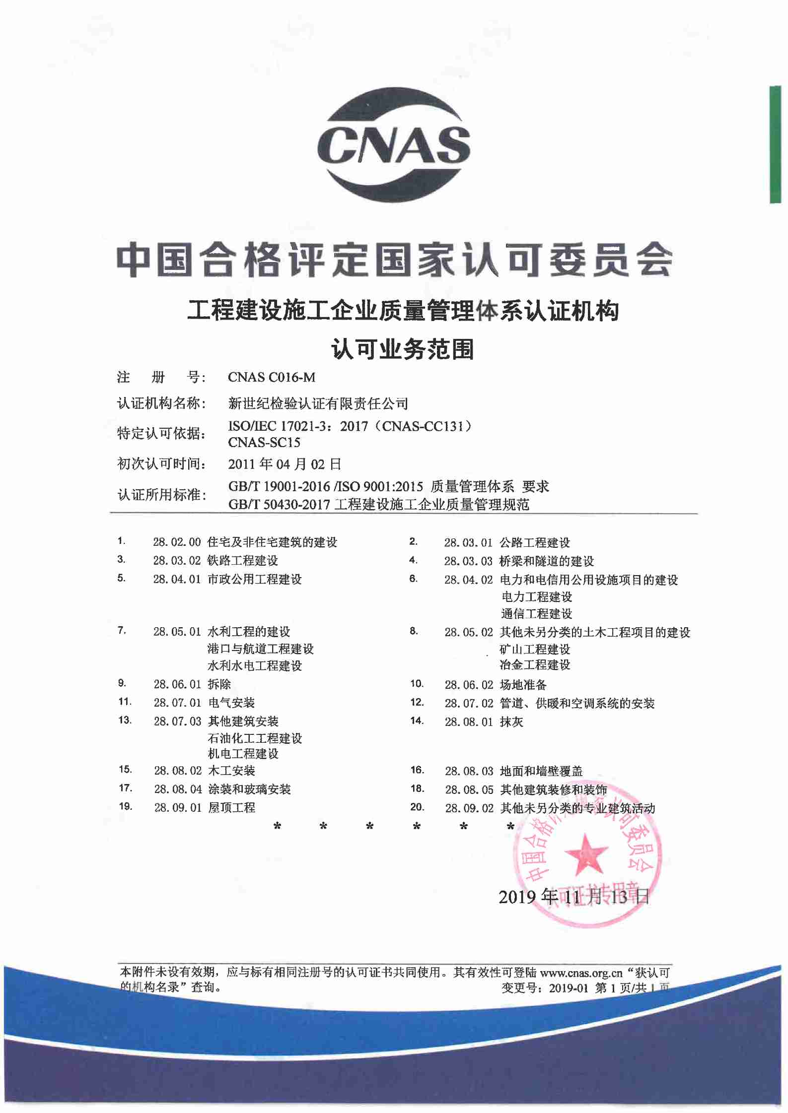 工程建設施工企業(yè)質量管理體系認證機構認可證書
