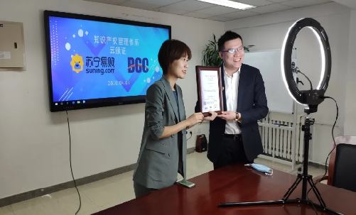 “云頒證”儀式,BCC為蘇寧易購頒發(fā)知識產(chǎn)權(quán)管理體系認證證書!