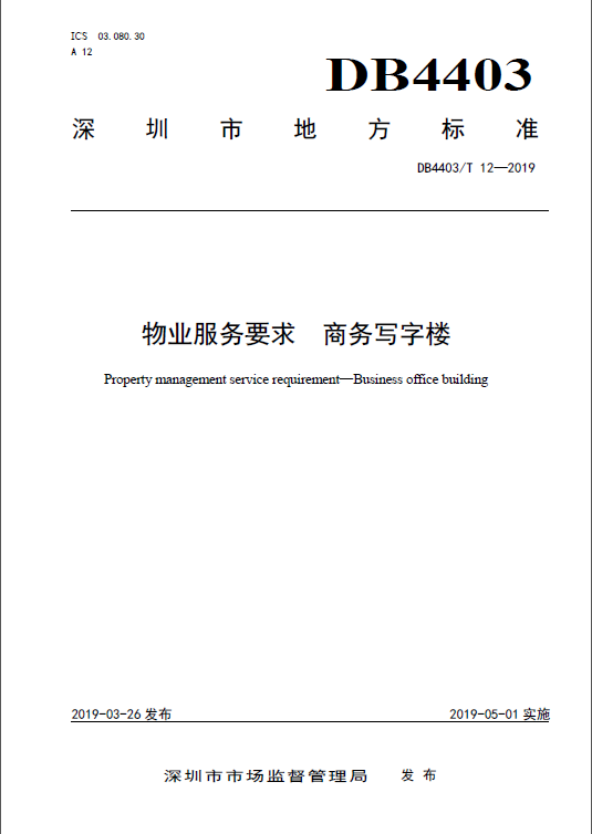 深圳市市場監(jiān)管局自2016年開始籌備物業(yè)服務(wù)認(rèn)證工作,歷經(jīng)三年多,在深圳標(biāo)準(zhǔn)認(rèn)證聯(lián)盟和標(biāo)準(zhǔn)技術(shù)研究院的大力支持下,中航物業(yè)和SGS通標(biāo)標(biāo)準(zhǔn)技術(shù)服務(wù)有限公司經(jīng)過行業(yè)走訪調(diào)研、專業(yè)論證、條款編寫、標(biāo)準(zhǔn)評審,終于在2019年5月1日聯(lián)合發(fā)布了首個服務(wù)類深圳認(rèn)證標(biāo)準(zhǔn)DB 4403/T 12—2019《物業(yè)服務(wù)要求 商務(wù)寫字樓》,標(biāo)準(zhǔn)引入了先進的服務(wù)接觸理論和服務(wù)質(zhì)量評價模型,從客戶感知和企業(yè)自身管理兩個角度提出服務(wù)要求和管理要求,結(jié)合深圳市商務(wù)寫字樓的先進技術(shù)和先進方法,具有較強的科學(xué)性和適用性,達(dá)到了國內(nèi)領(lǐng)先、國際一流水平。認(rèn)證按照深圳標(biāo)準(zhǔn)認(rèn)證聯(lián)盟發(fā)布的首個服務(wù)認(rèn)證實施規(guī)則實施。