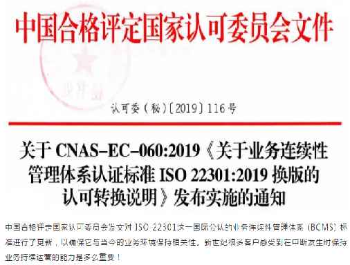 2019年12月31日,中國合格評定國家認(rèn)可委員會(CNAS)發(fā)布了關(guān)于CNAS-EC-060:2019《關(guān)于業(yè)務(wù)連續(xù)性管理體系認(rèn)證標(biāo)準(zhǔn)ISO22301:2019換版的認(rèn)可轉(zhuǎn)換說明》發(fā)布實(shí)施的通知。