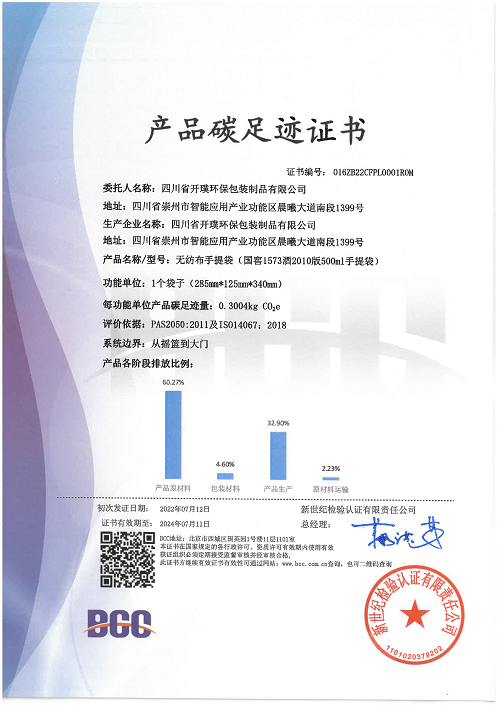 BCC審核組采用現(xiàn)場(chǎng)與遠(yuǎn)程審核相結(jié)合的形式,依據(jù)PAS 2050:2011及ISO 14067:2018標(biāo)準(zhǔn),對(duì)開(kāi)璞環(huán)保的無(wú)紡布手提袋(國(guó)窖1573酒2010版500ml手提袋)進(jìn)行產(chǎn)品碳足跡核查。