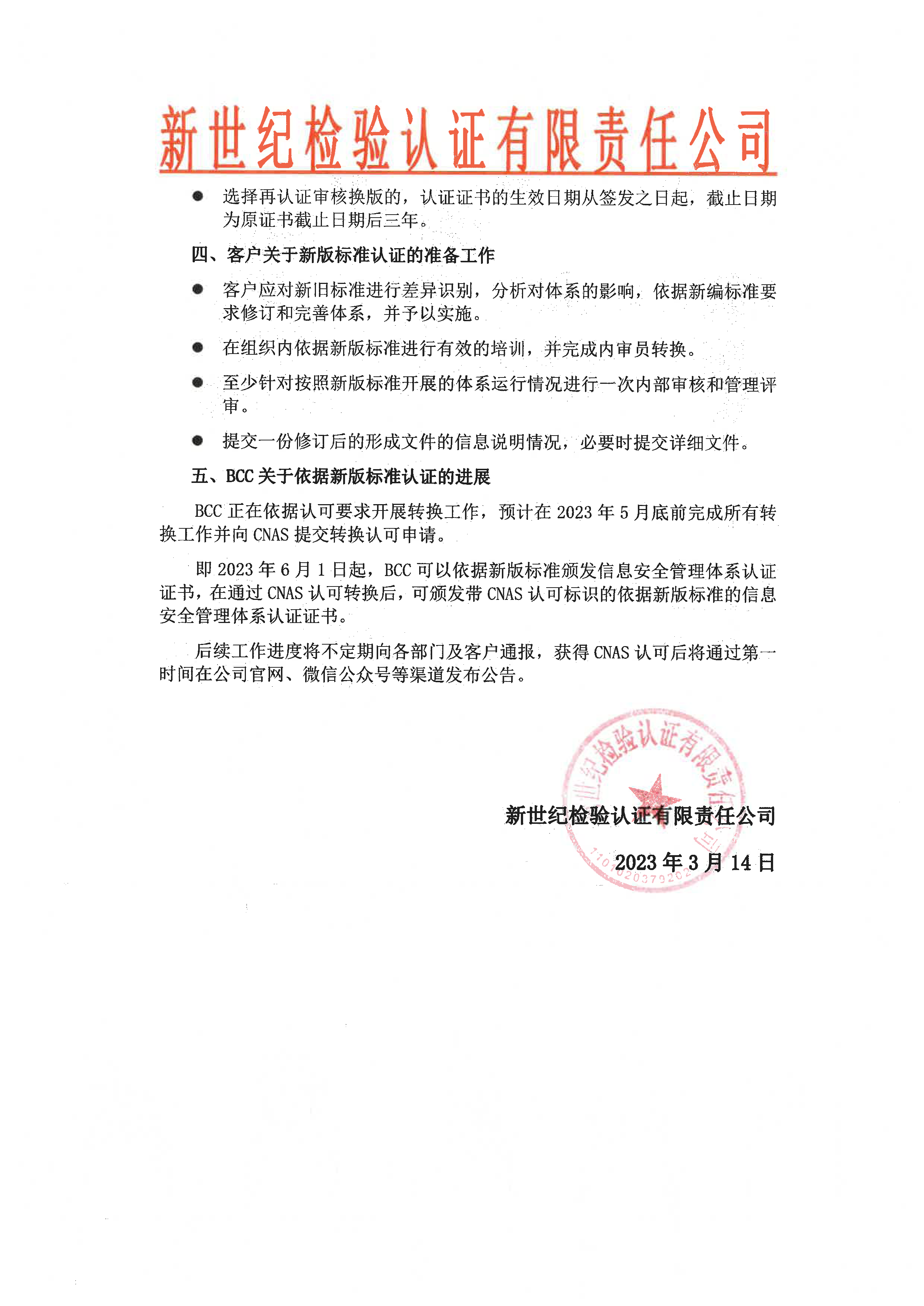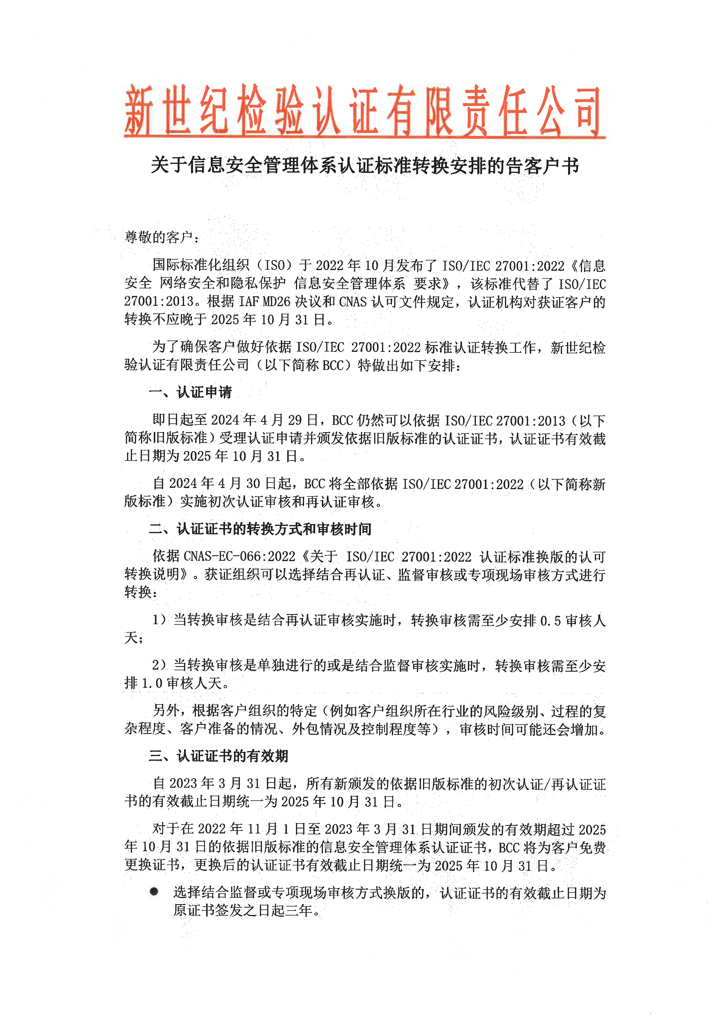 關(guān)于信息安全管理體系認證標準轉(zhuǎn)換安排的告客戶書