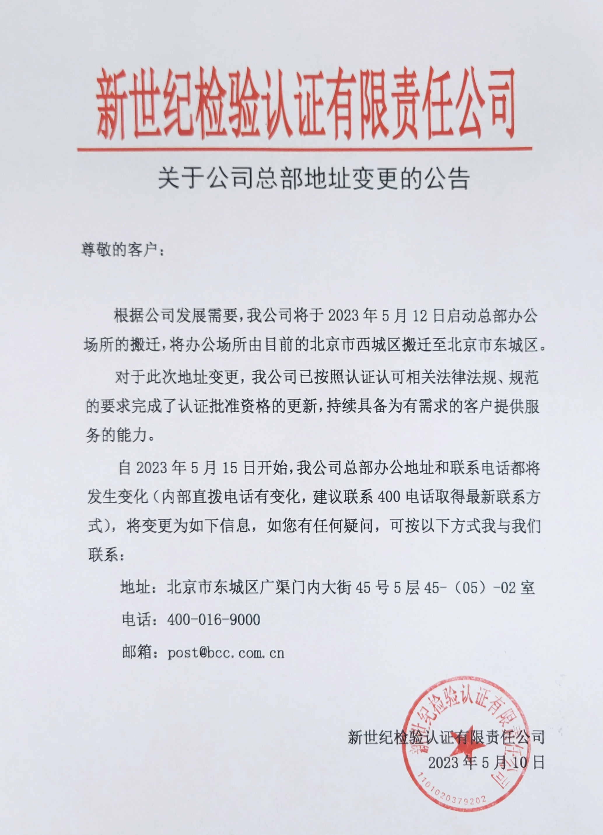 對(duì)于此次地址變更,我公司已按照認(rèn)證認(rèn)可相關(guān)法律法規(guī)、規(guī)范的要求完成了認(rèn)證批準(zhǔn)資格的更新,持續(xù)具備為有需求的客戶提供服務(wù)的能力。