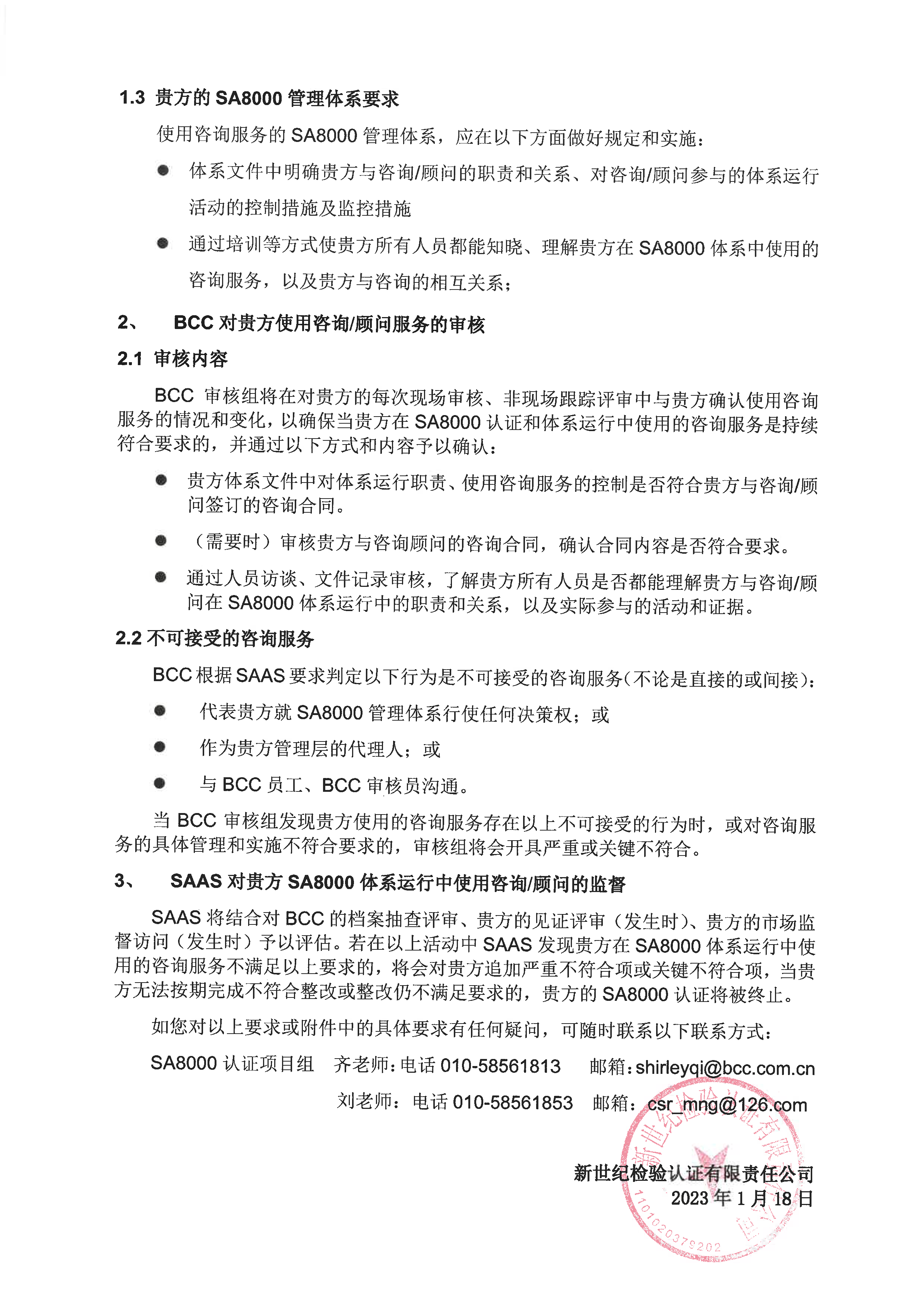 該文件中對(duì)認(rèn)證機(jī)構(gòu)、SA8000已獲證客戶、新申請(qǐng)SA8000認(rèn)證的組織都提出了更具體的要求,這些要求將在2023年2月1日實(shí)施。以下就該文件中與貴方有關(guān)的內(nèi)容予以說(shuō)明告知,BCC審核組也將自2023年2月1日開始在審核中向貴方了解、收集、確認(rèn)以下信息,請(qǐng)貴方提前知悉: